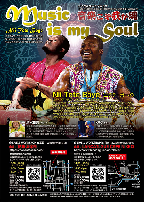 日本国内外での演奏のほか、ガーナ音楽を広 めるため各地でワークショップを開催。幼稚園や学校での演奏活 動にも力を入れている。